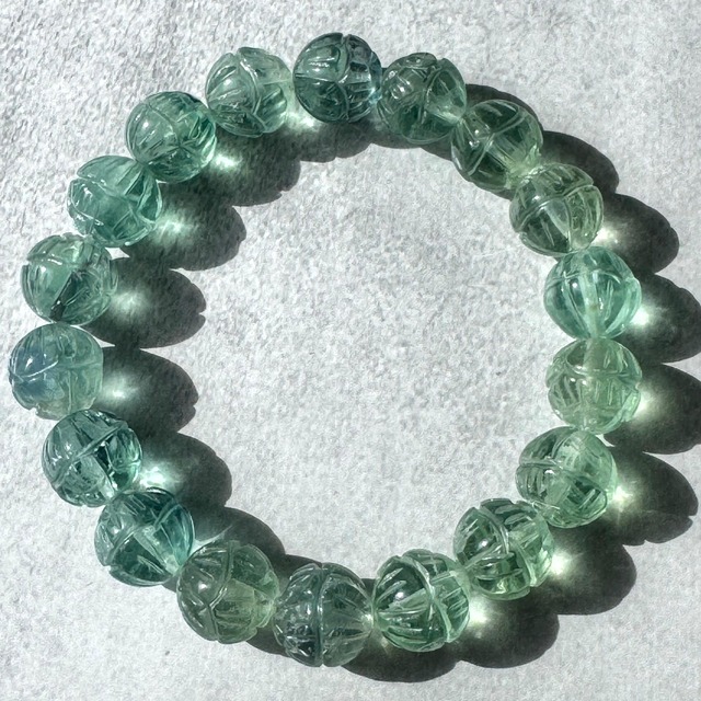 ブルーグリーンの美しいフローライトにロータスカットを施したブレスレットです。 蓮のカットがとても美しく、フローライトの透明感を引き立たせます。 11ミリ 内径16センチ フローライトのヒーリング効果 ○受験のお守り ○ネガティブな感情を解消する ○頭の疲れをとる ○集中力と思考力を高める ○自由を求める心を強める ○記憶力を高める ○抑圧された感情の解放 ○無邪気な発想と思考 【天才の石】とも称される事もあるフローライト。 フローライトは、大人になるにつれて固定化されてきた思考パターンや抑圧された感情から自分自身を解き放つ為に働き、子供の頃の自由で無邪気な発想や思考力を高めてくれます。 脳や海馬を活性化させ、明晰性や記憶力を高める石でもあり、受験勉強の時などに持っていると頭の疲れを和らげるのに役立ちます。もちろん受験のお守りにもオススメです。 また、問題解決を助ける石でもあり、悩みや迷いのある人に対して目の前の霧を晴らすようにエネルギーを純化し、道を示す灯台のように解決の糸口を照らしてくれる石でもあります。 フローライトは色別にエネルギー的特性が多少異なります。あくまでも傾向としてですが、パープル系は明晰性や感受性を高める傾向、グリーン系は癒し的に働き、グラデーションカラーのものは、想像力を高める傾向が強いようです。