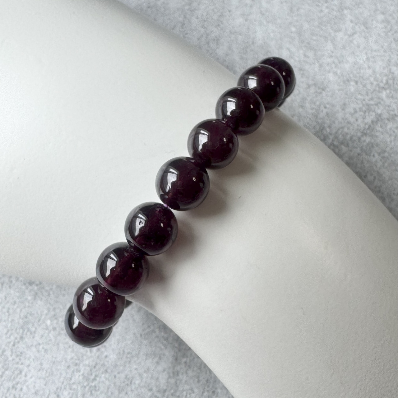 透明感があり、透かすとほんのりピンク味のある赤が素敵なガーネットブレスレットです。
