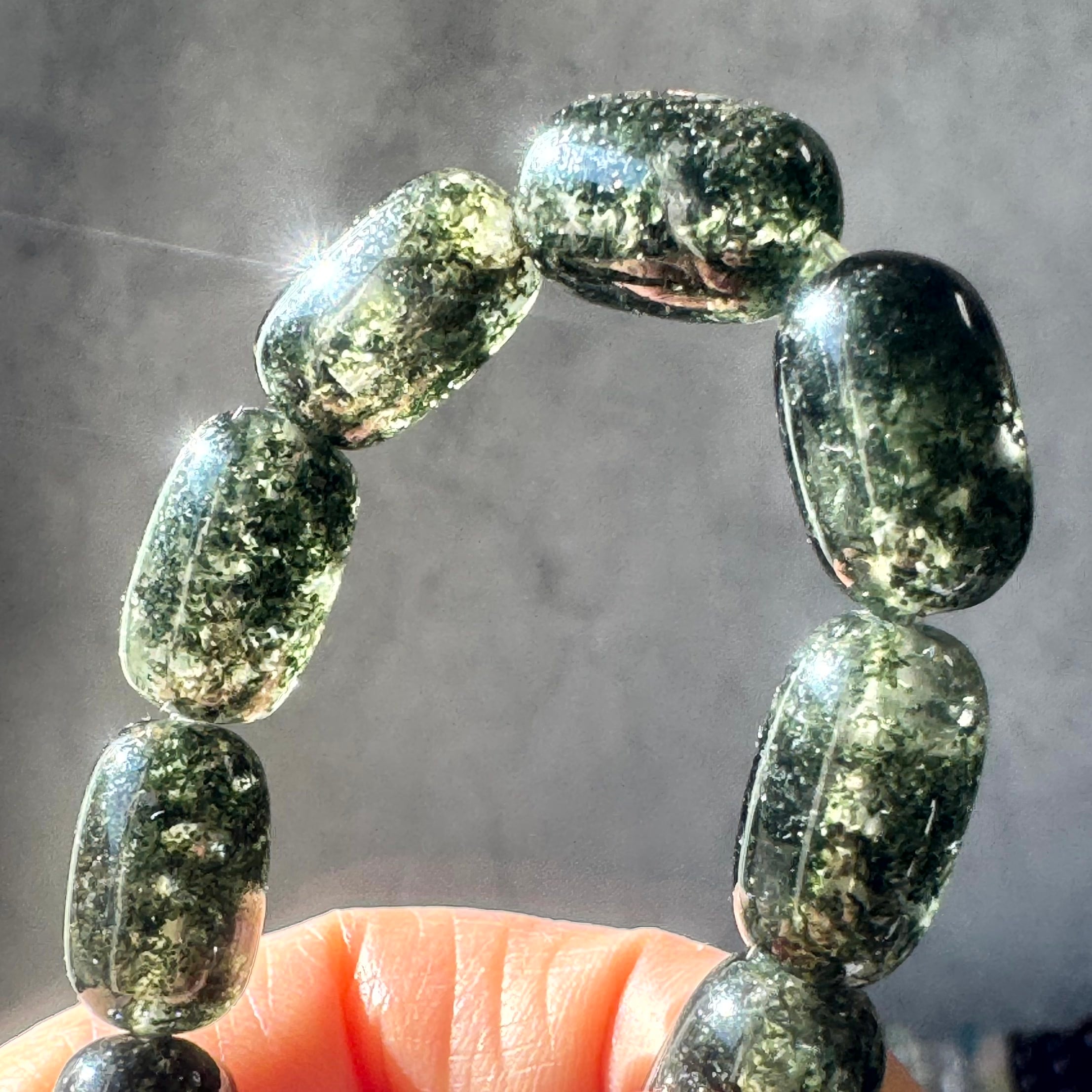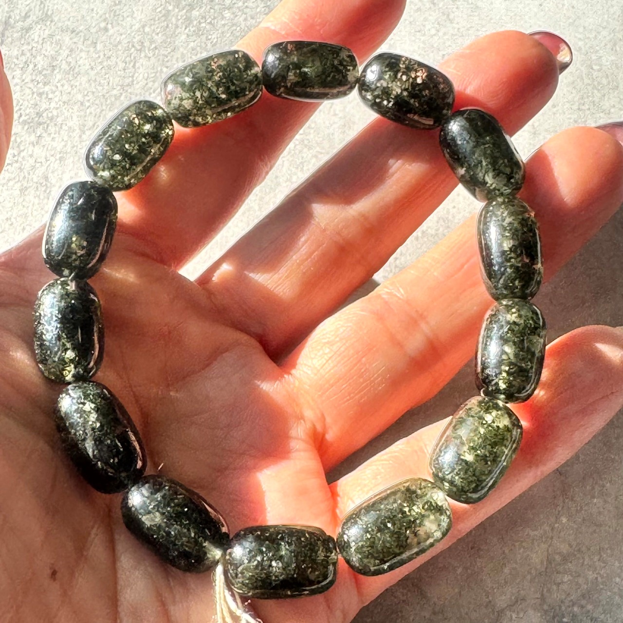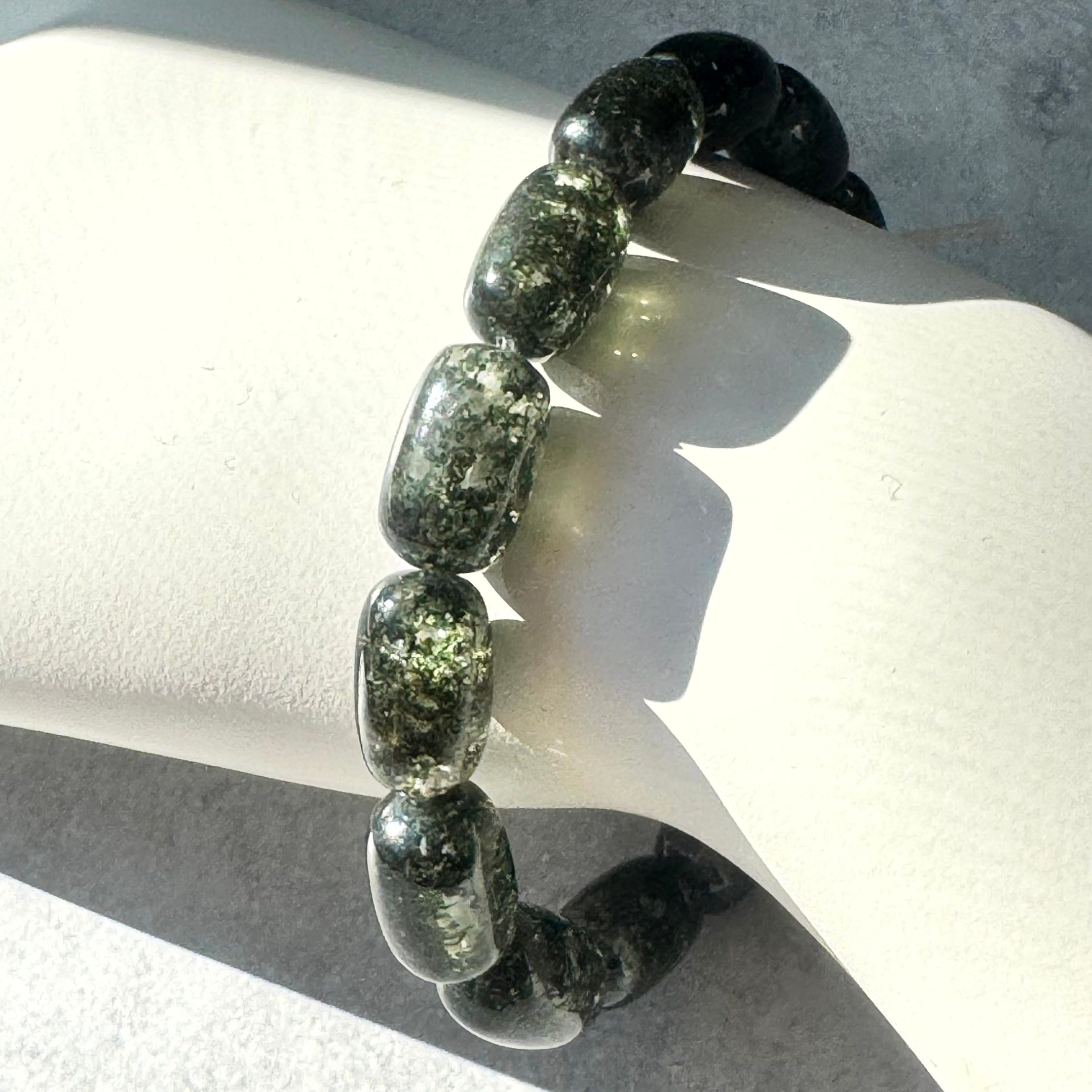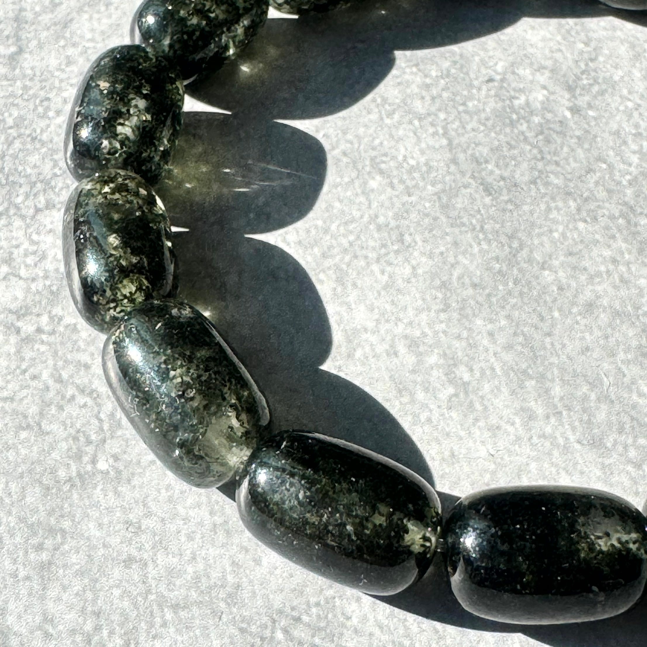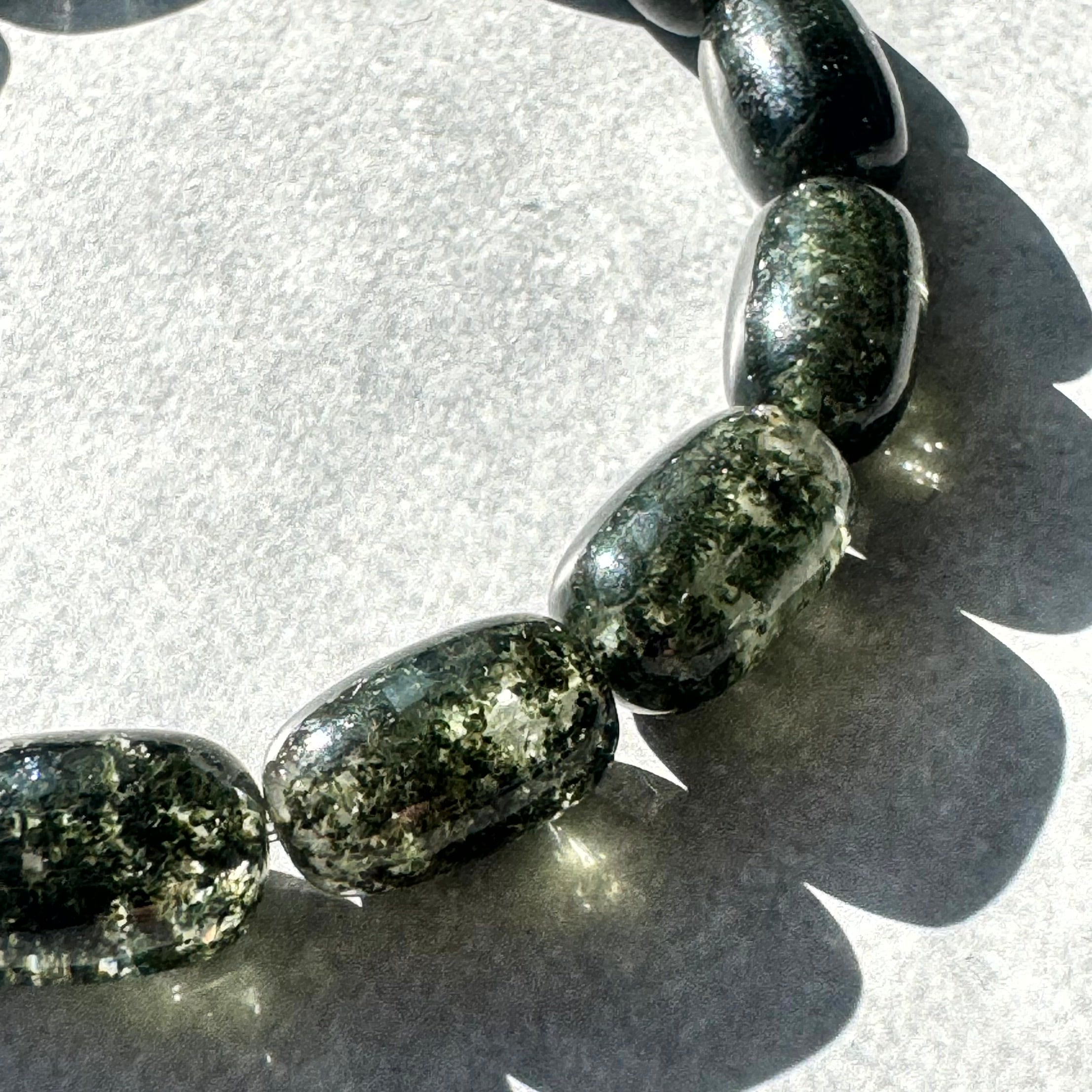 一見黒に見えますが、グリーンガーデンクォーツのチューブカットブレスレットです。