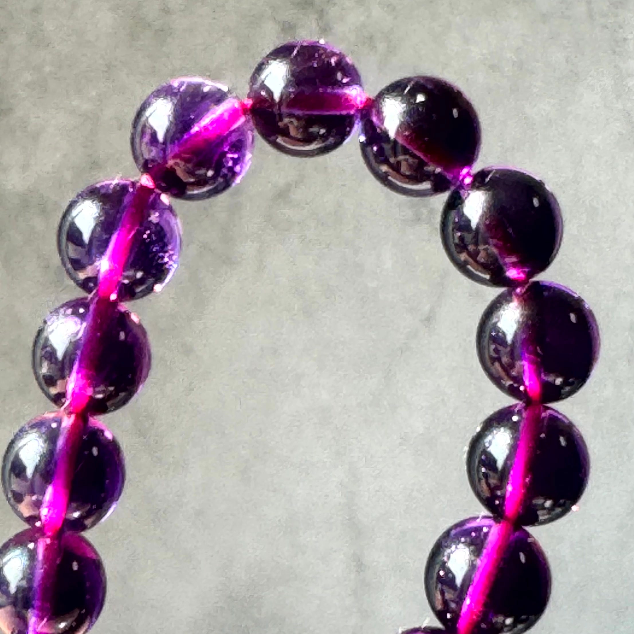 小粒の中に深い紫がぎゅっと凝縮された、アメジストエレスチャルのブレスレットです。ひと粒ごとに異なる表情を見せる内包物が光を受けてきらりと輝き、小粒とは思えないほどの濃厚な存在感を手元に添えてくれます。透明感の奥に秘めた神秘的な深みが、大人の女性の装いに静かな華やぎを与える一本です。