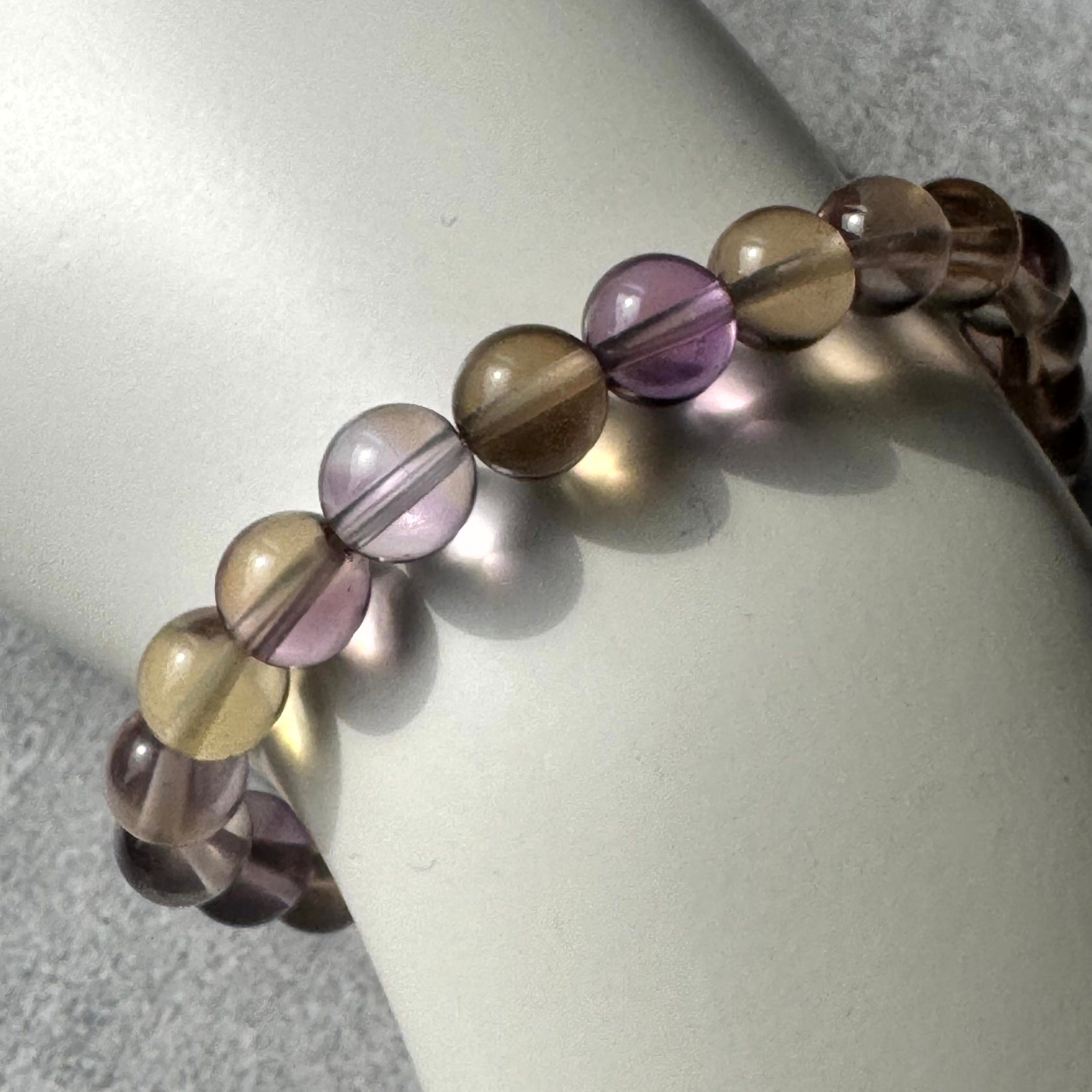 淡い黄金色がふわりと広がるシトリン多めのアメトリンに、小粒ならではの可憐な輝きが重なるブレスレットです。紫と黄金がやさしく溶け合うグラデーションが光の中でそっと揺れ、手元に明るく上品な彩りを添えてくれます。軽やかで親しみやすい雰囲気の中に、アメトリンらしい透明感と特別感がしっかりと感じられる一本です。