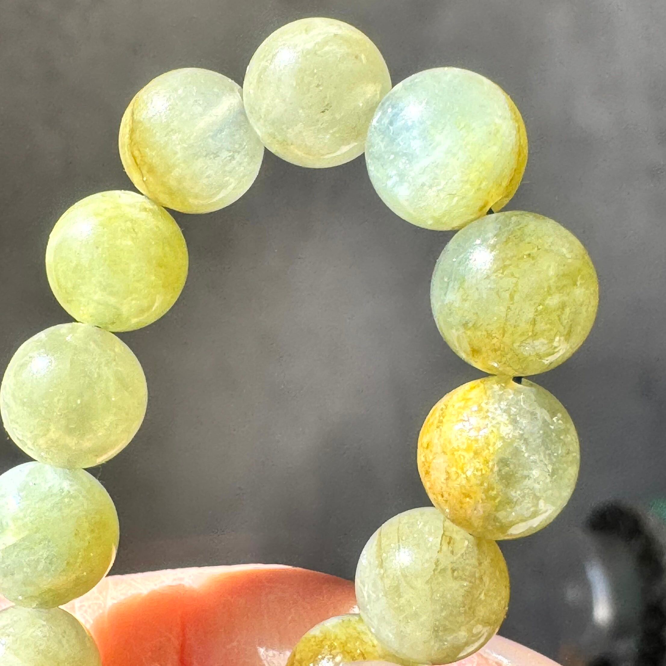 水色と若草色がふわりと溶け合う、やさしい彩りが魅力のバイカラーアクアマリンブレスレットです。透明感のある結晶の中で二色が自然に寄り添い、光を受けるたびに淡いブルーとグリーンのニュアンスが揺らめきます。春の風のように軽やかで、手元にそっと明るさと癒しを添えてくれる一本です。