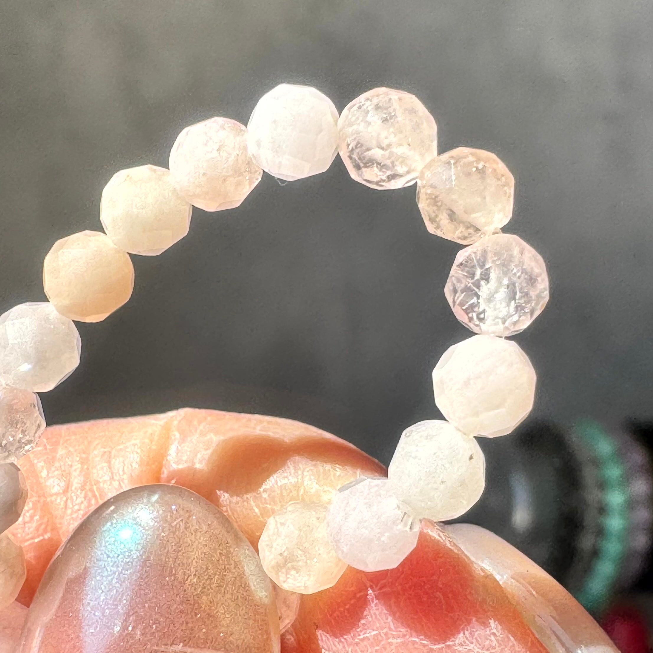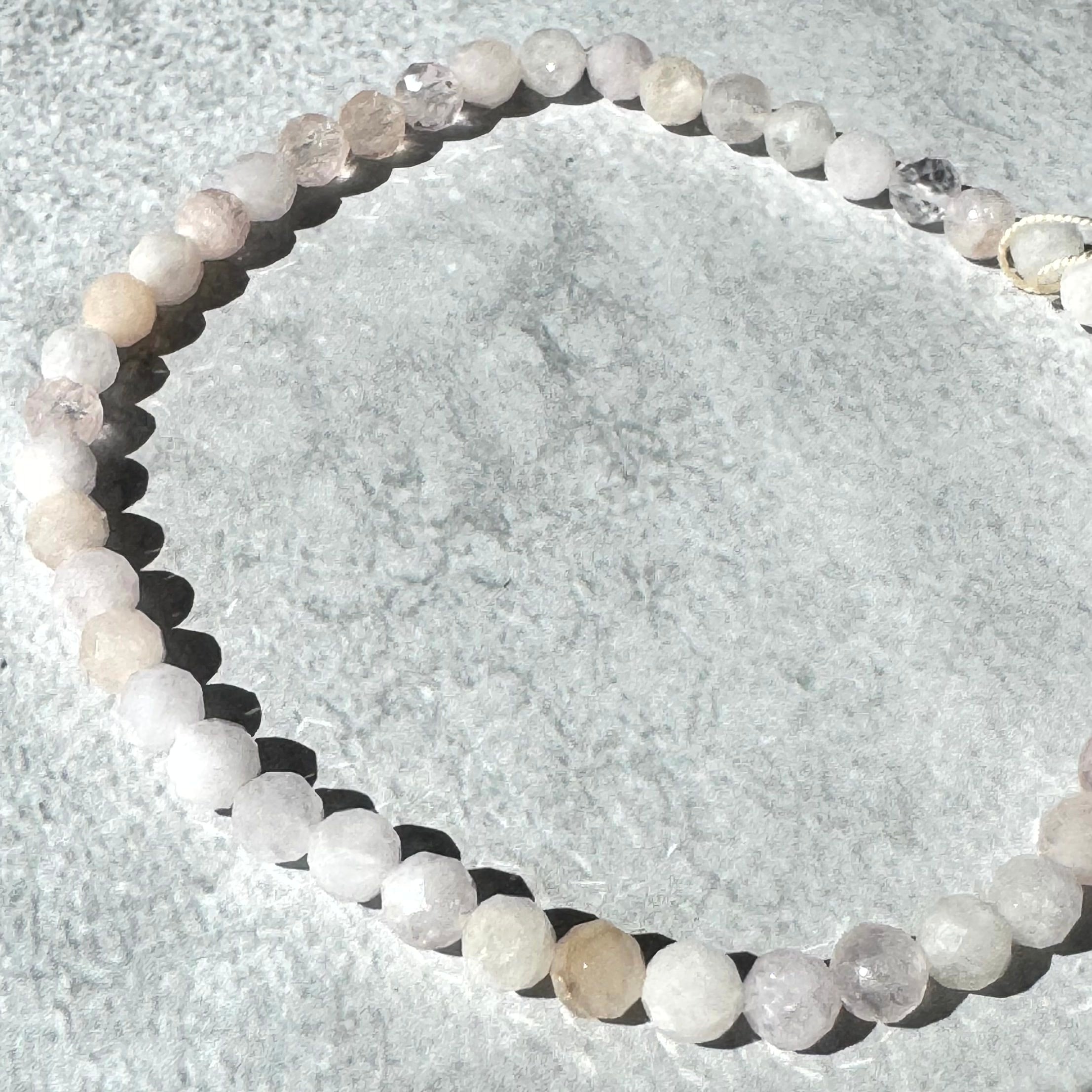 淡い桜色がふわりと広がる、小粒モルガナイトのラウンドカットブレスレットです。ひと粒ひと粒に繊細なカットが施され、光を受けるたびに可憐なきらめきが手元で優しく踊ります。小粒ならではの上品さと、モルガナイト特有の柔らかなピンクが重なり、日常にそっと春色のときめきを添えてくれる一本です。