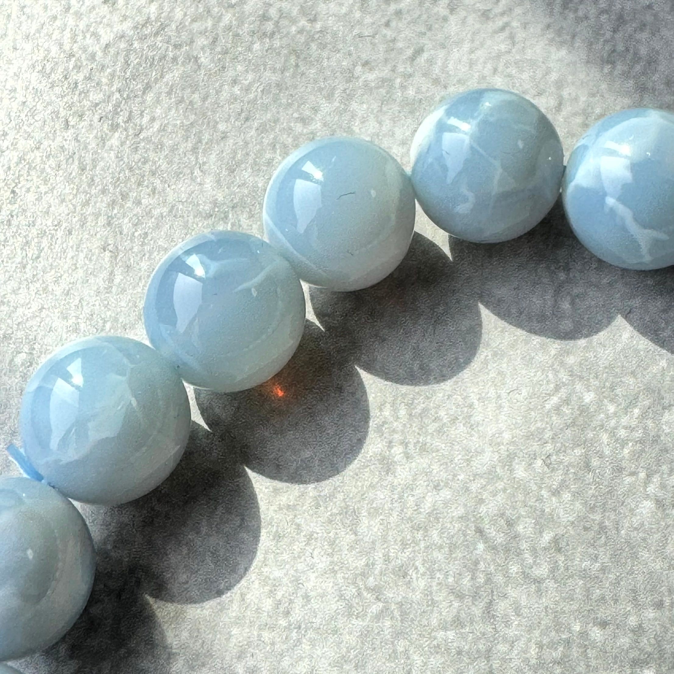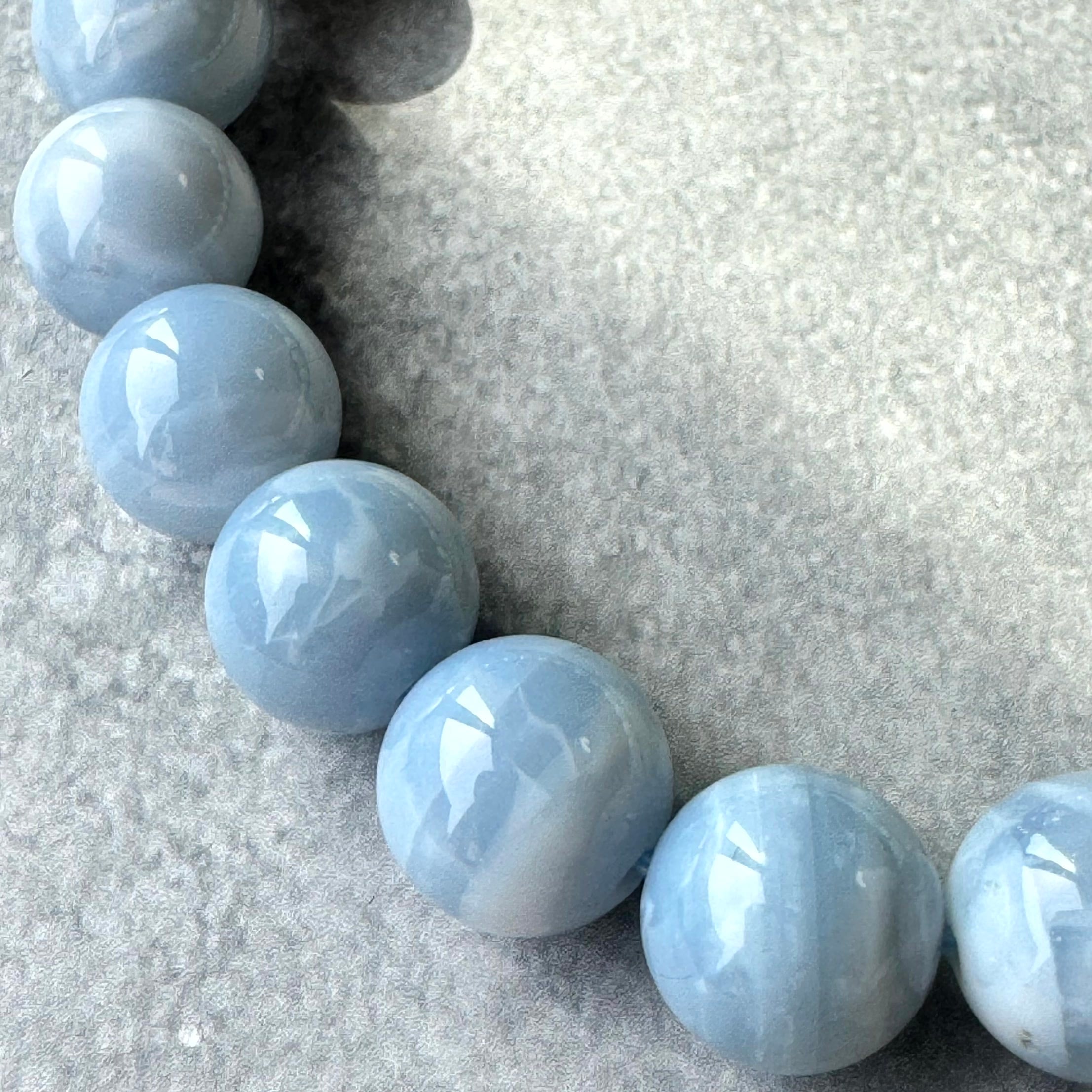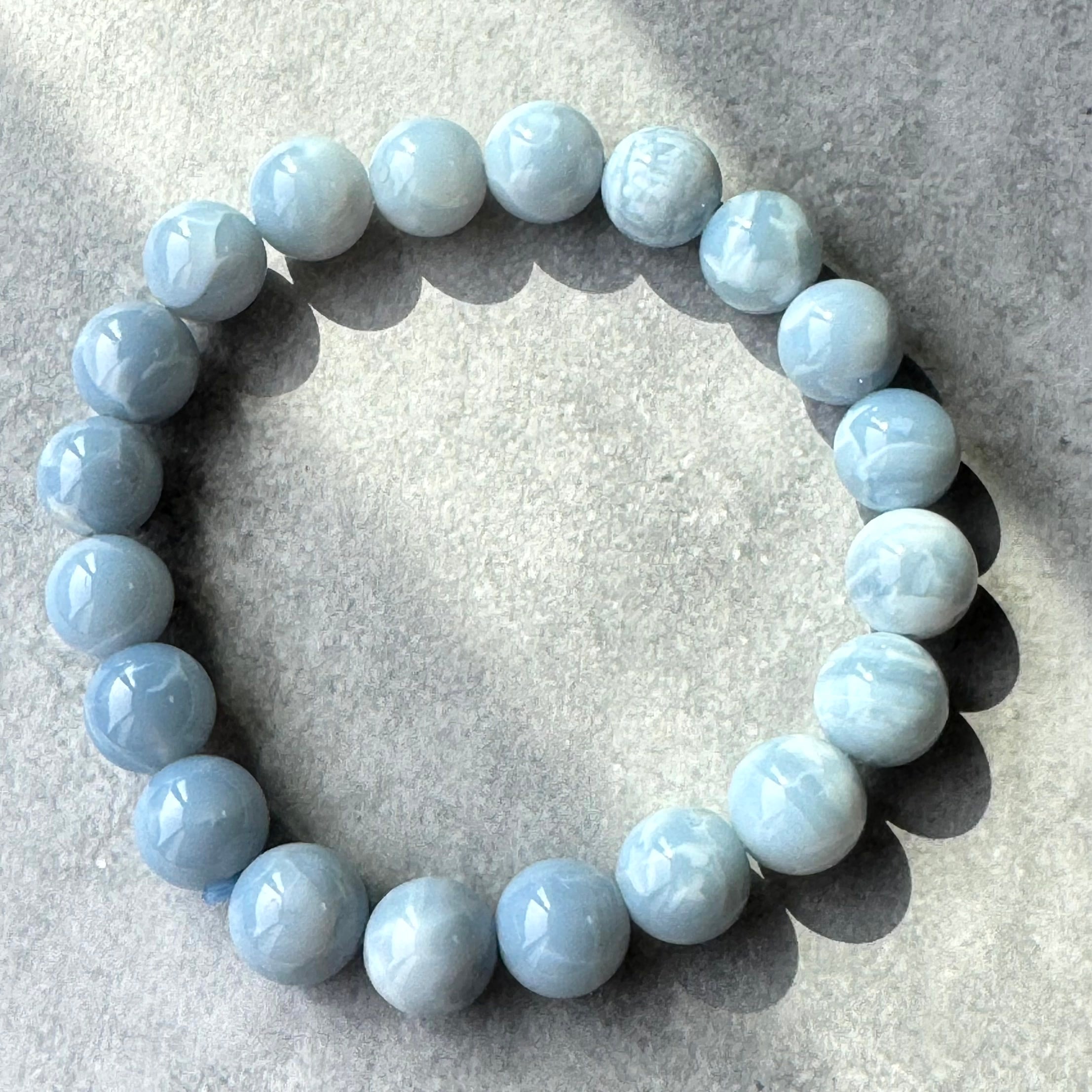 淡い空色がふわりと広がる、ブルーオパールのブレスレットです。ミルキーなブルーの中に柔らかな光がにじみ、手元にそっと癒しを添えてくれるような優しい雰囲気があります。透明感と落ち着いた色味が重なり、日常に静かなときめきを運んでくれる一本です。