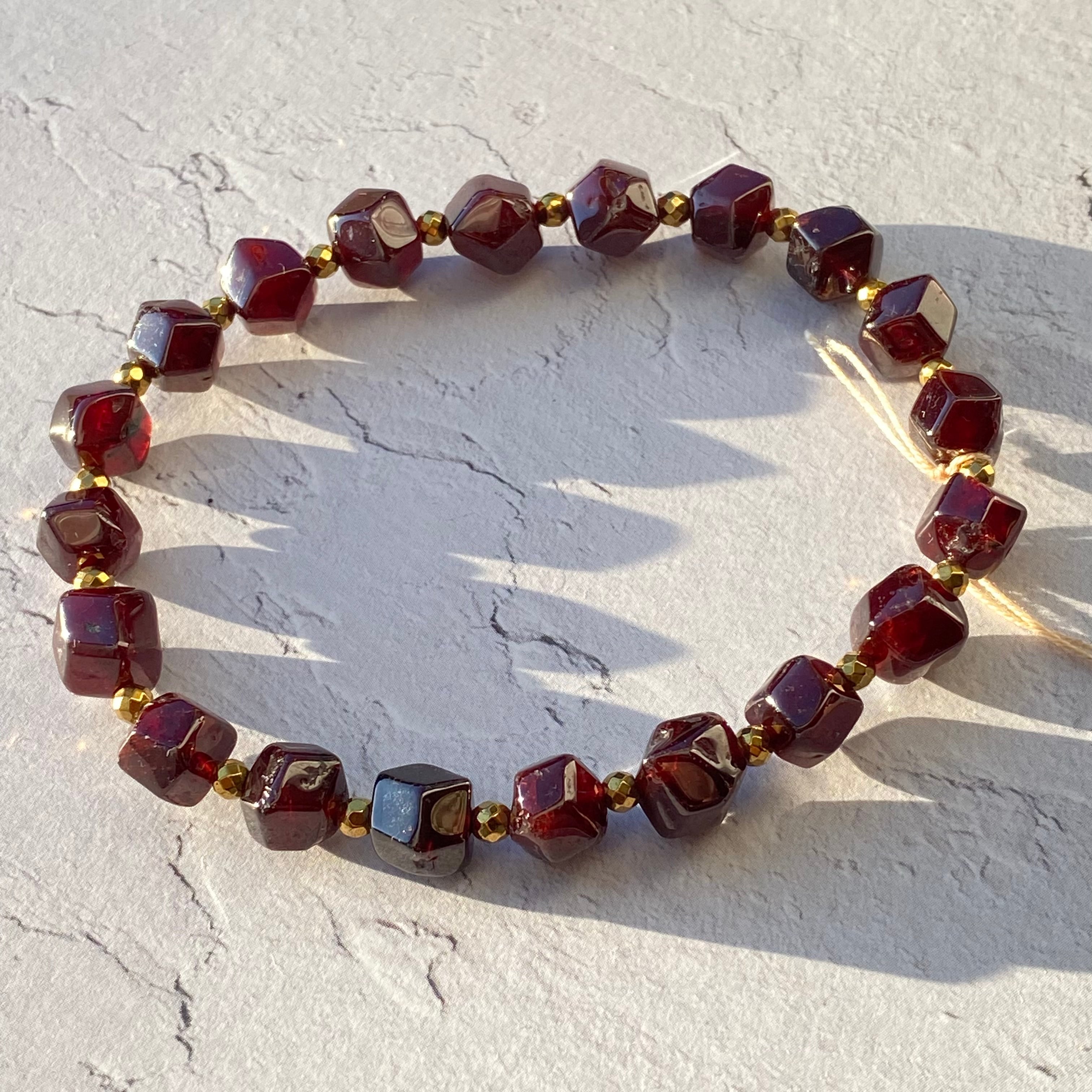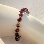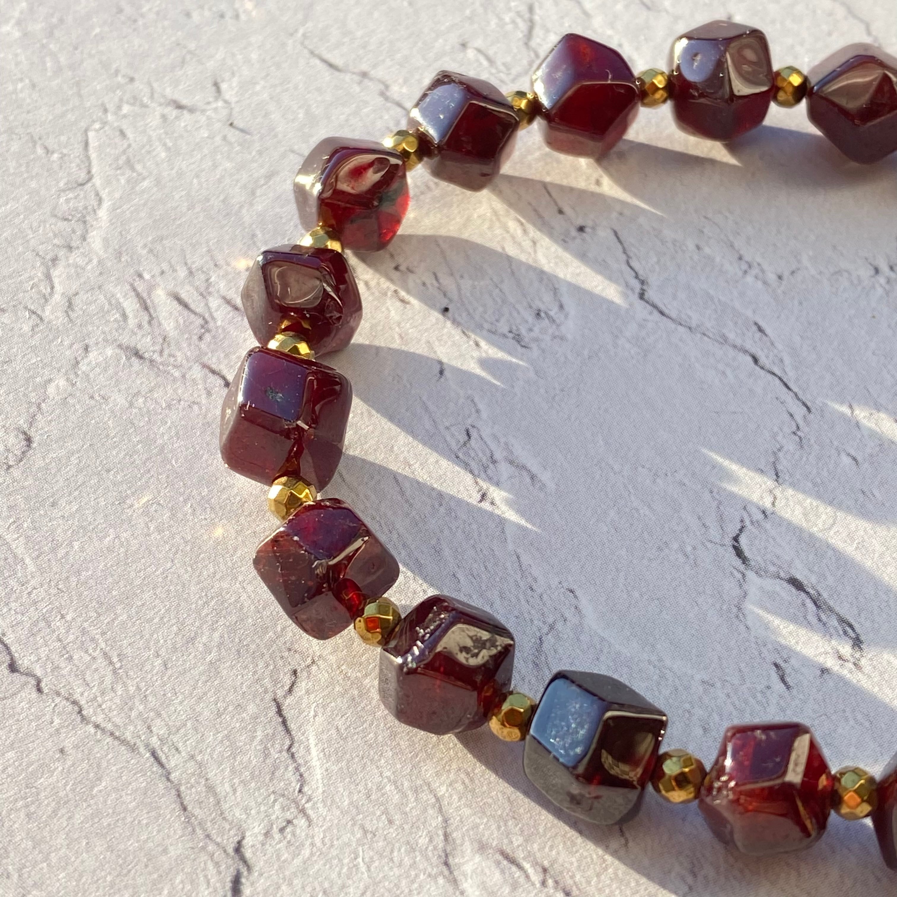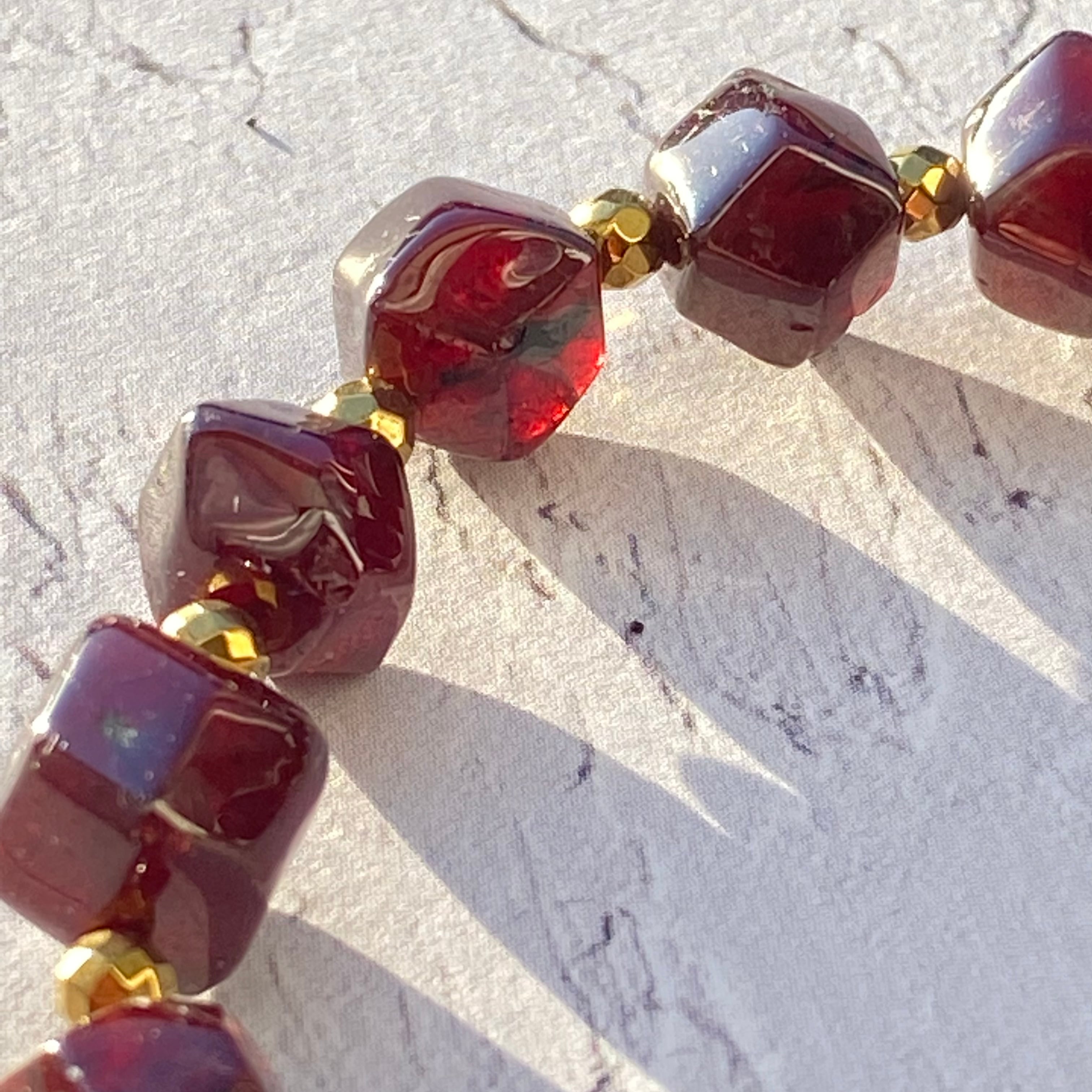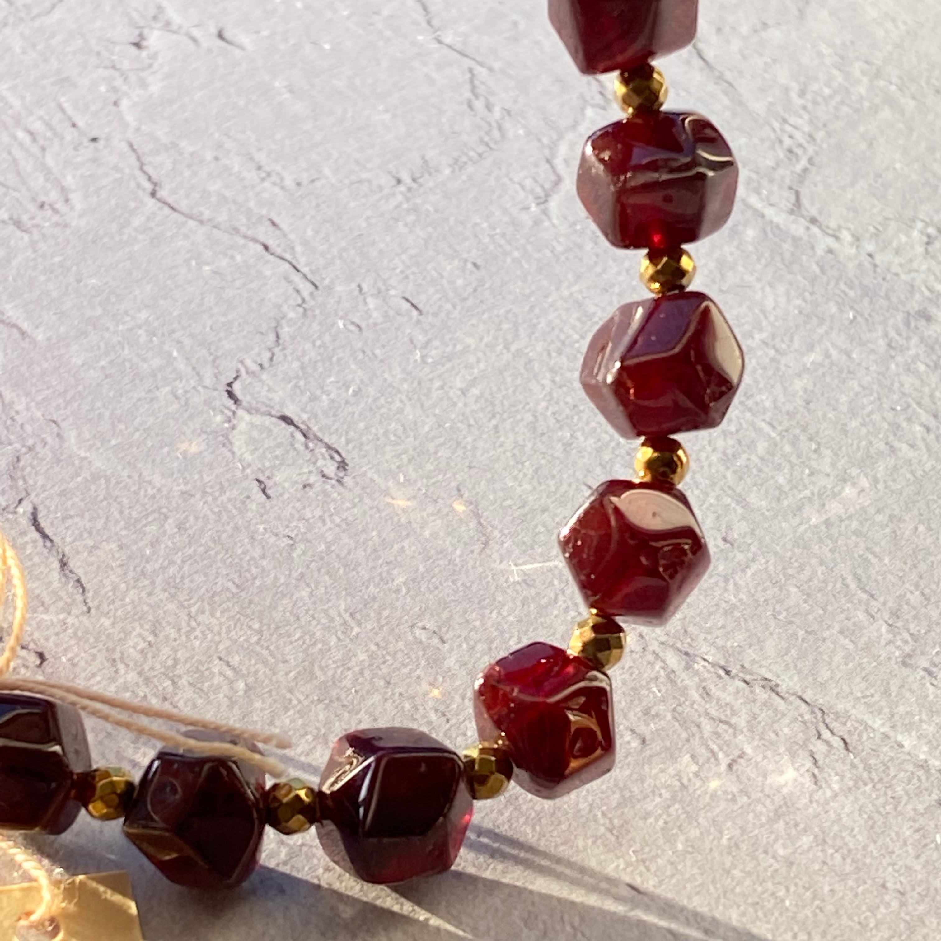 原石から軽く磨いた感じのヒマラヤ産ガーネットとヘマタイトのゴールドコーティングを合わせたブレスレットです。ゴロゴロ感が可愛く、光をかざすととても美しいです。