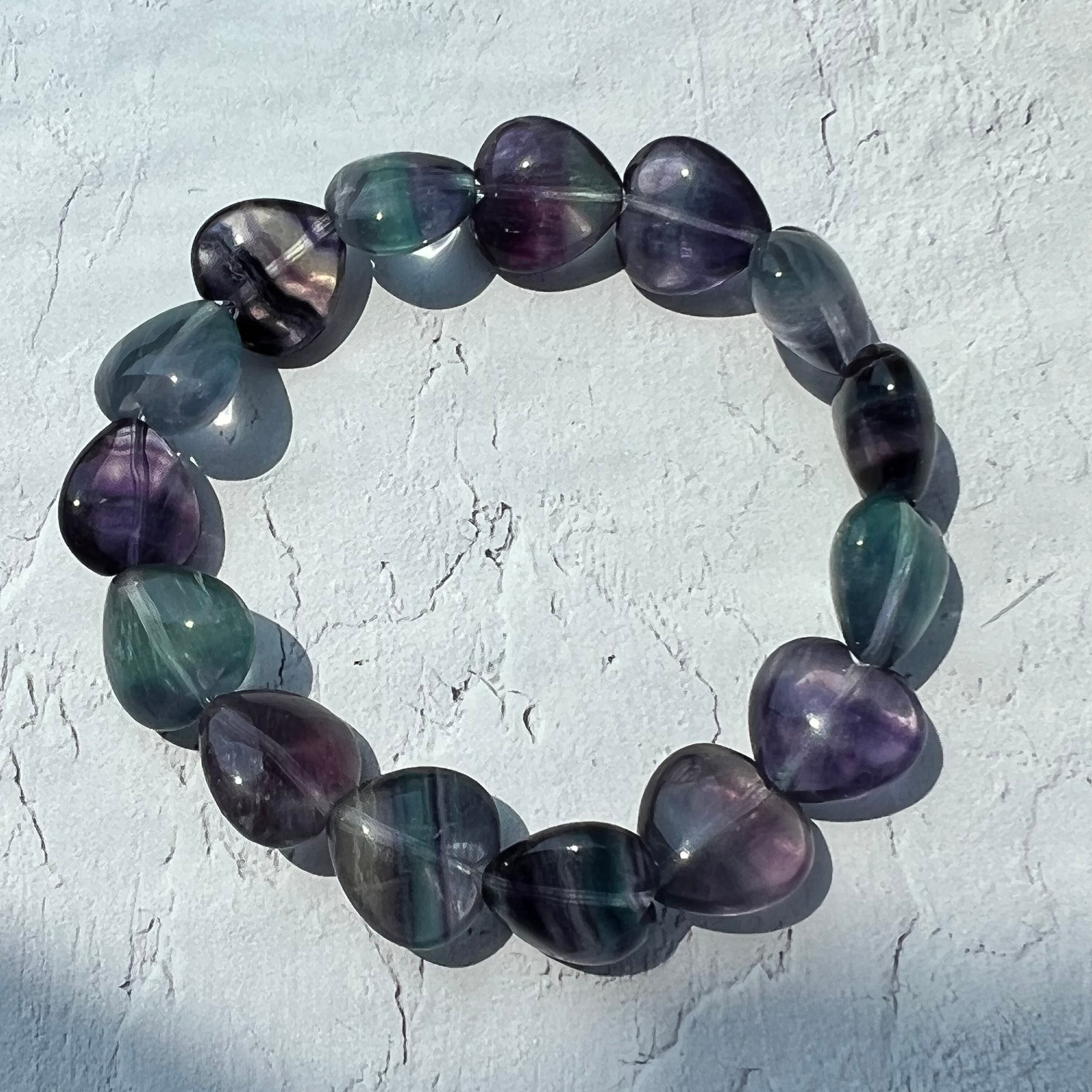 パープルやブルーの模様が美しいフローライトのハートカットのブレスレットです。